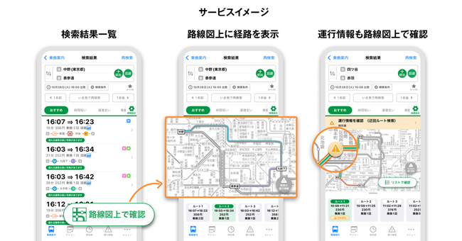 同機能は、複数のルート候補を路線図上で比較できるようにしたもので、各ルートの所要時間、運賃、乗換回数などの詳細情報も合わせて確認できる。ルート検索機能にて、電車のみ、または徒歩と電車のみのルート検索結果画面に表示されて、「路線図上で確認」ボタンをタップすると路線図上にルート情報が表示される。また、ルート上で運行情報が発生している場合は発生区間を路線図上で表示し、代替となる迂回ルートが路線図上に表示される。