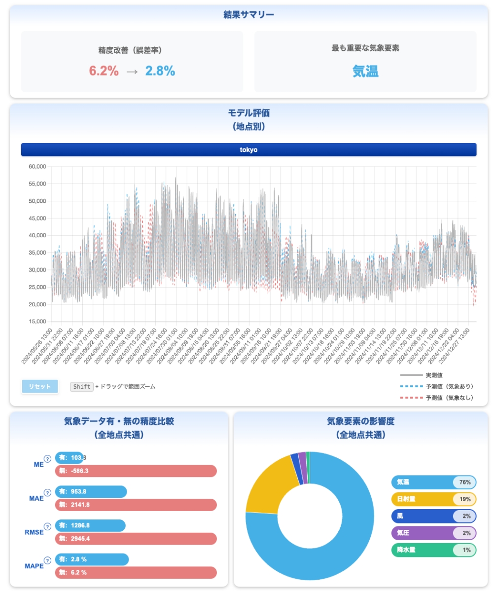 分析に用いる気象データは1時間ごとの検証の場合は1kmメッシュの高解像度の気象予測データを利用しており、ピンポイントで影響の分析を行える。また、気象データを利用したAI予測モデルと、気象データを利用しないAI予測モデルの精度を比較することにより、気象データを活用することでどれくらい需要予測の精度向上に貢献するかを確認することもできる。データは最大2年分までアップロードすることが可能で、最大で約5カ月分の検証結果のデータを確認できる。