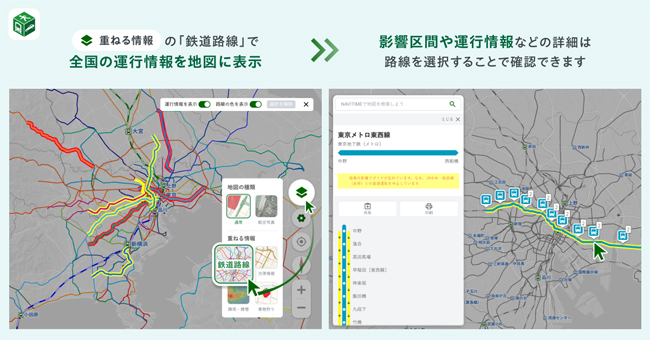 全国のJRや私鉄を含む全路線の路線図を地図上に再現し、路線図をクリックすると路線形状と停車駅が表示される。また、鉄道の運行情報を地図上に重ねて表示することが可能で、運休区間を線描画で色分けして表示するため迂回ルートを検討しやすい。